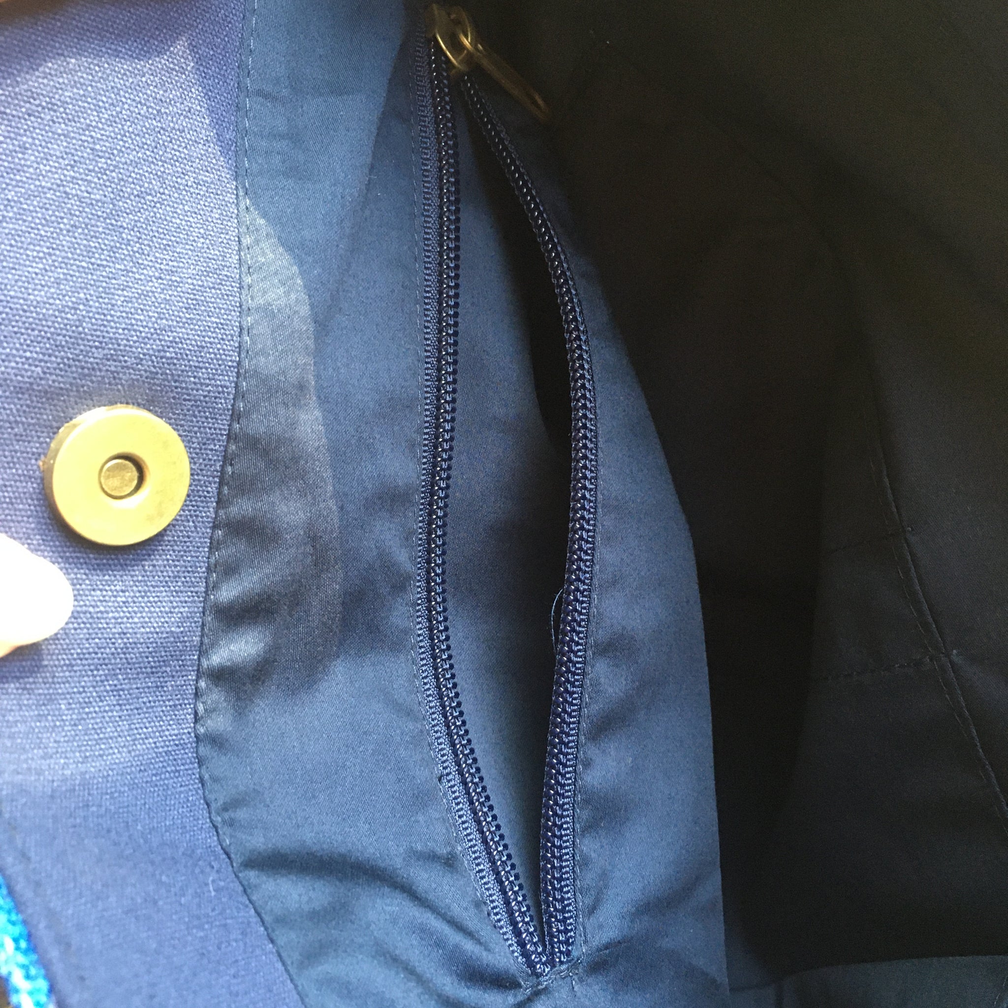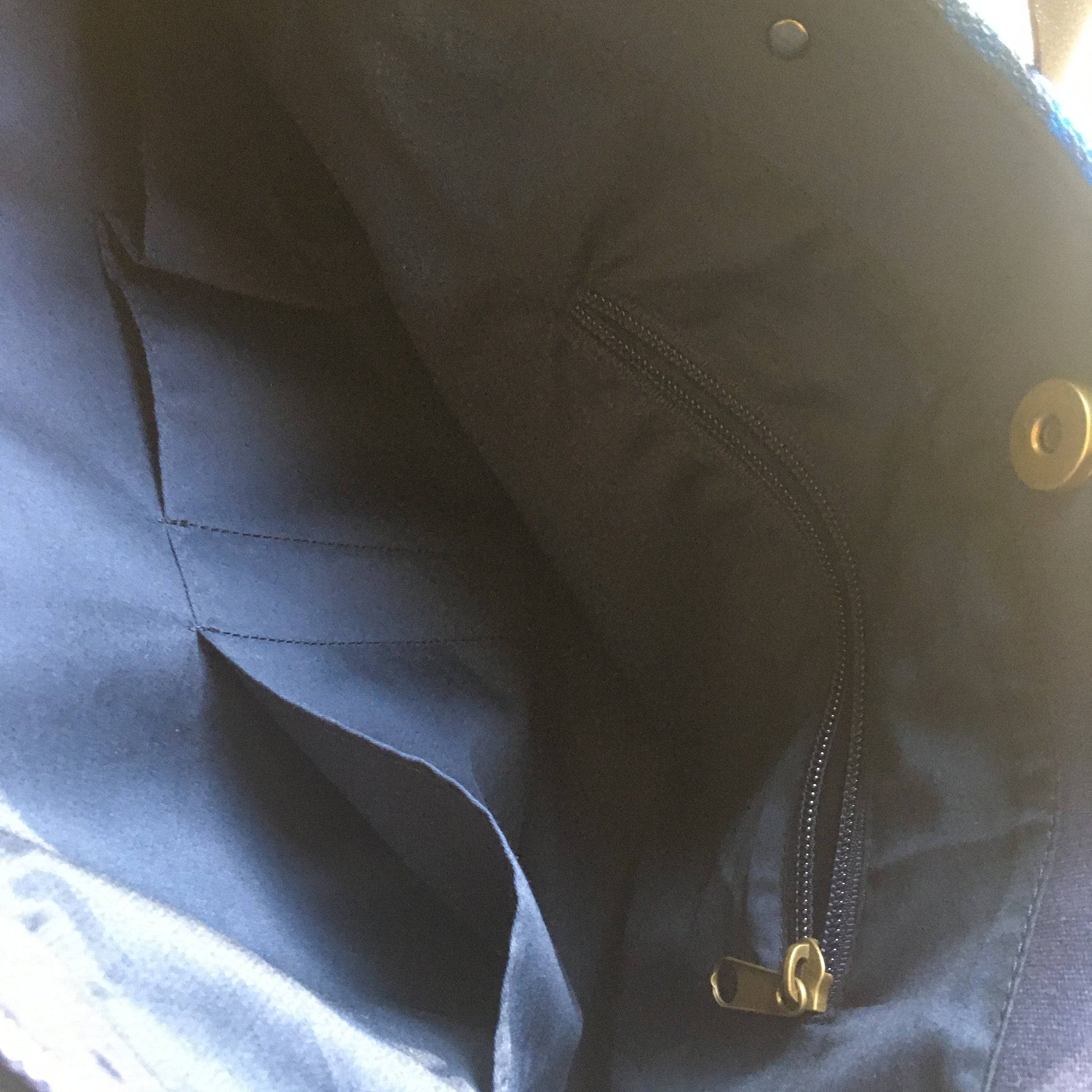 -Cotton Sateen Lining with pockets: Our urban tote is lined with 100% navy cotton sateen and includes 2 inside slip pockets and 1 zippered welt pocket (see images below).